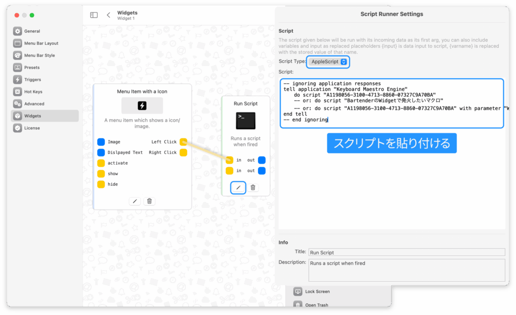 このコードをWidgetsの「Run a Script」ノードの設定を開いて、「Script Type」をAppleScriptに変更して、スクリプト欄にKeyboard MaestroマクロのAppleScriptを貼り付けます。