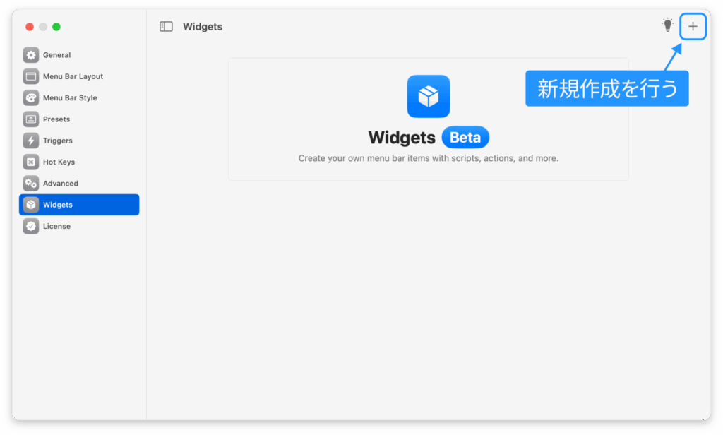 Bartenderの設定画面を開き、サイドバーの[Widgets]をクリックします。右上の「+」アイコンをクリックすると新規Widgetが追加されます。
