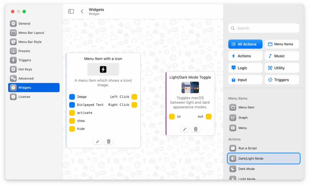 このようにWidgetsでは、ノードを並べてそのノード内の要素をドラッグでつないでいくことで、簡単にメニューバーアイテムを自作できます。