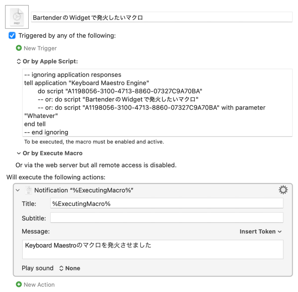 Keyboard Maestroのマクロを発火させたい場合は「Run a Script」を使います。
