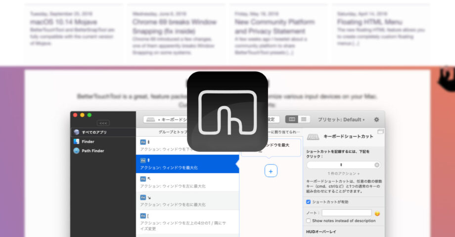 そのため、ショートカットキーはBetterTouchToolで設定しています(マウス操作でのリサイズはMagnetを使用しているが、ショートカットキーにfnを使用できない)。