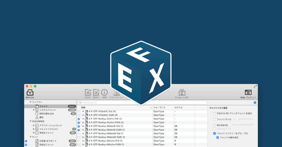 macOS標準のFont Bookでは、大量にフォントをインストールすると動作が不安定になったり、インストールしたフォントを有効化したり無効化したりできません。