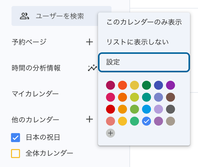 Googleカレンダーを開いて、左下に「他のカレンダーの設定」が表示されている場合は、マウスオーバーして「…」アイコンをクリックすると[設定]メニューが表示されます。