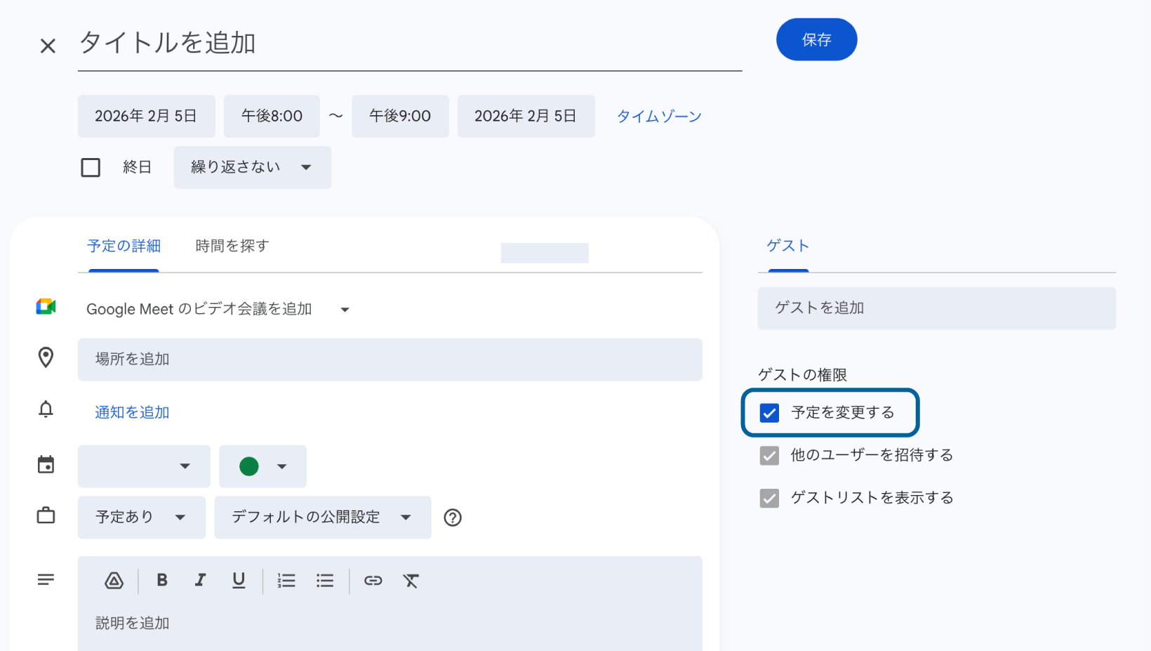このチェックを入れておくと、ゲストの人も予定の変更ができるようになります。