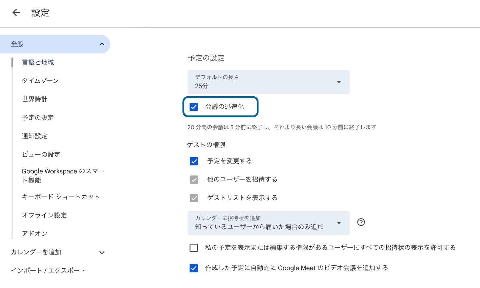 ちなみに、[設定]→[全般]→[予定の設定]にある「ゲストの権限」のデフォルトを設定することもできます。
