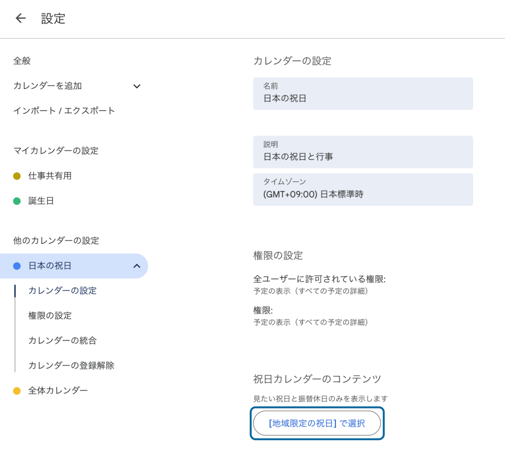 クリックするとカレンダーの設定画面に移動するので、下の方にスクロールして「[地域限定の祝日] で選択」ボタンをクリックします。