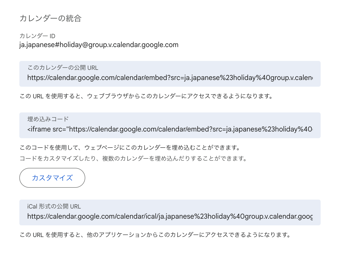 ja.japanese.official#holiday@group.v.calendar.google.comiCal形式の公開URLも、元の状態が下記です。