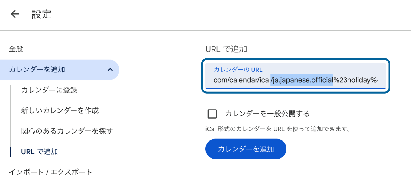 https://calendar.google.com/calendar/ical/ja.japanese%23holiday%40group.v.calendar.google.com/public/basic.icsそれを下記のように「ja.japanese」のあとに「.official」を追加します。