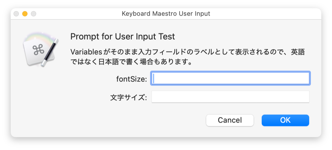 ただし、「Prompt for User Input」を使う場合、設定した変数名がそのままダイアログ内の入力フィールドラベルとして表示されてしまうので、日本語にする場合もあります。
