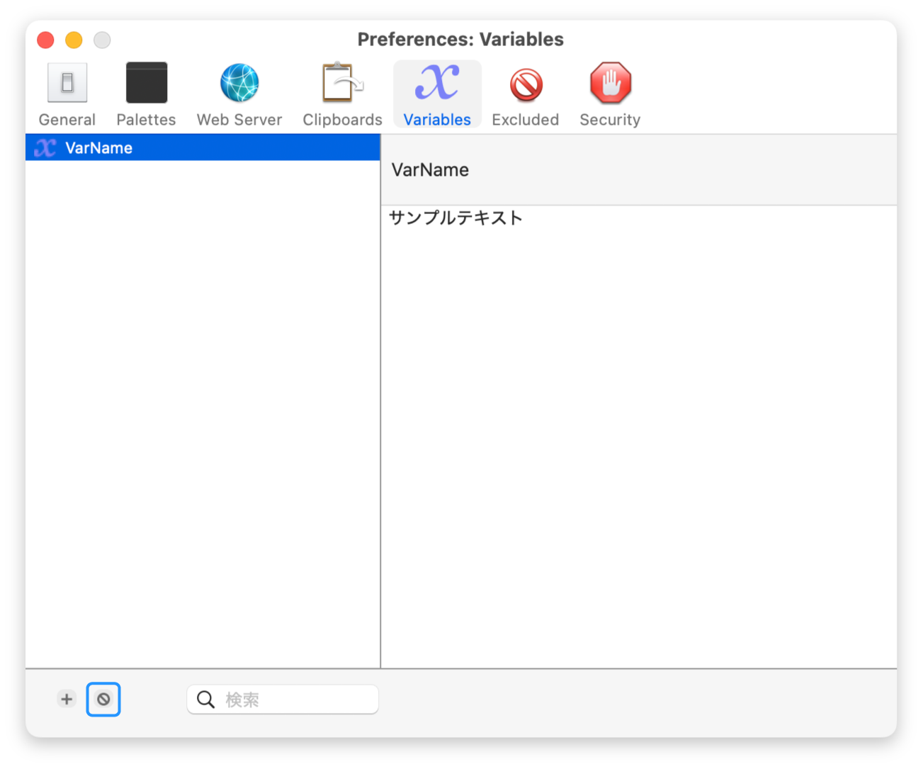 変数を削除したい場合は、[環境設定]の[Variables]タブを開くと一覧で確認でき、不要な変数は左下のアイコンクリックで削除できます。