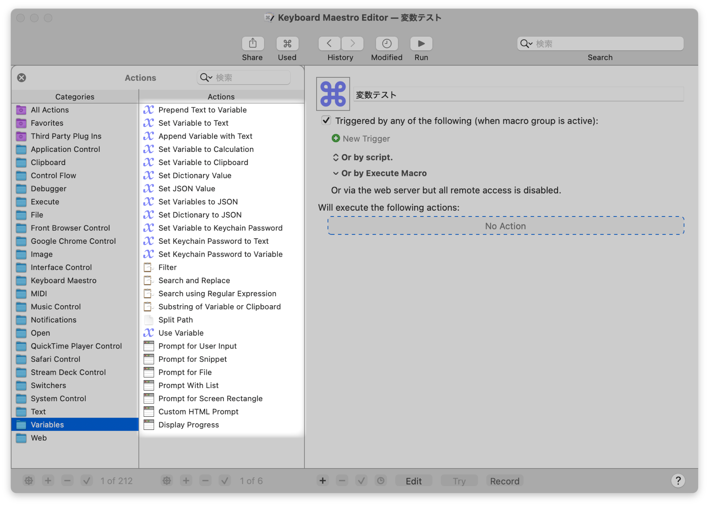 Keyboard Maestroの変数は、「Set Variable to 〇〇」系のアクションを使用します。