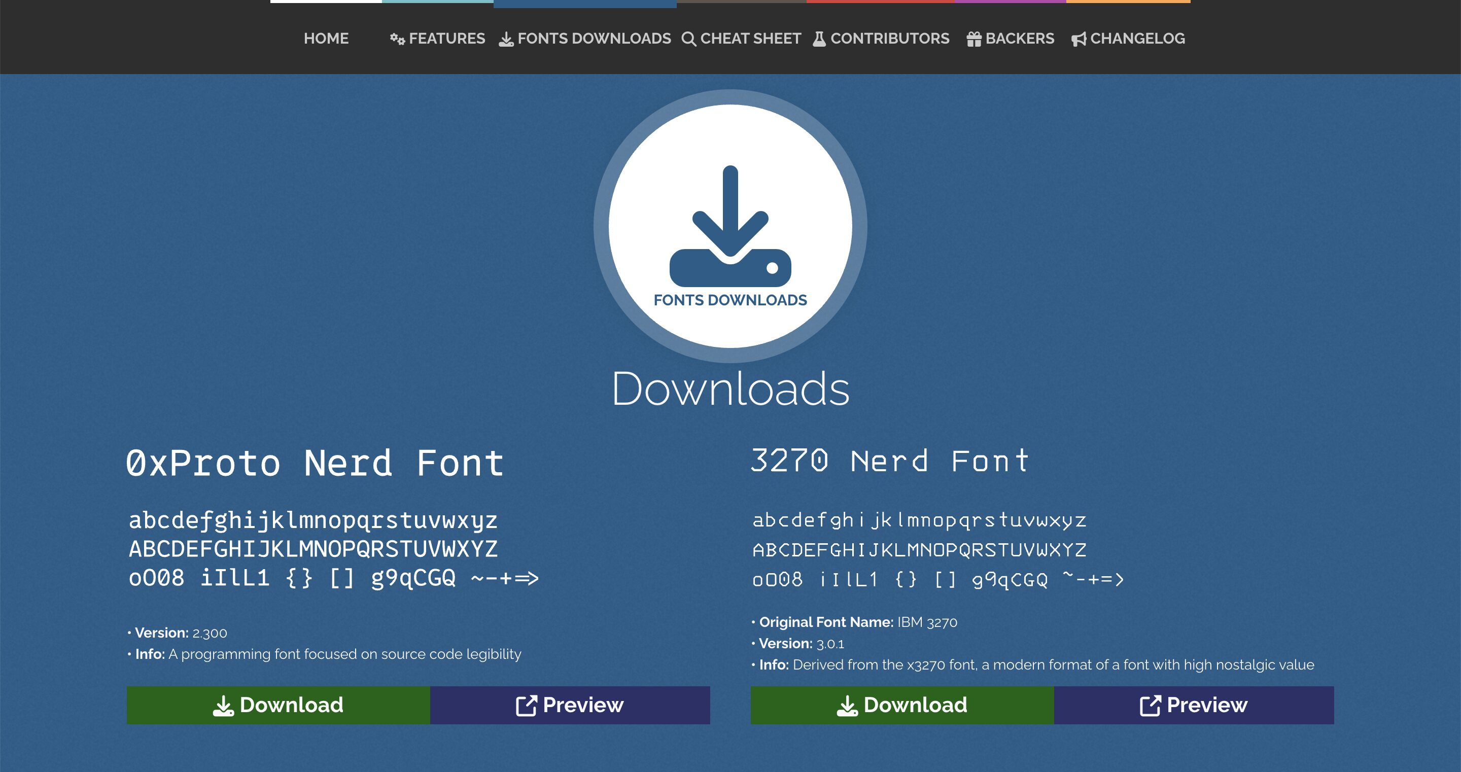 Nerd Fontsサイトのダウンロードページにさまざまなフォントが用意されているので、好きなものを使うようにしましょう。