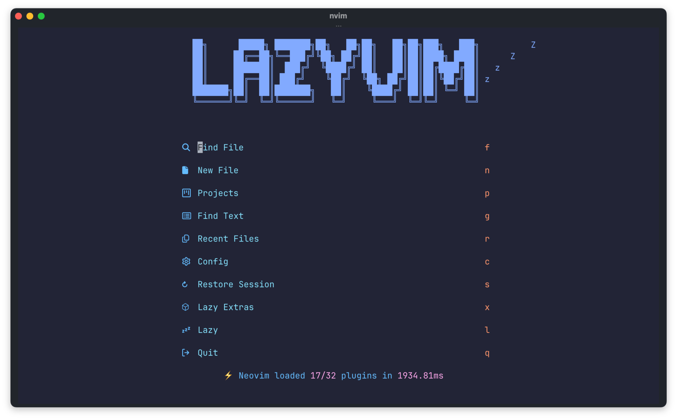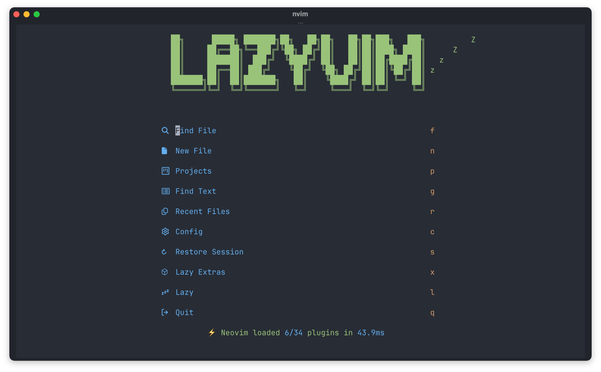 通常のVimやNeovimだとかなり簡素な画面ですが、LazyVimを入れるといきなり最初の段階からここまで設定された状態になります。