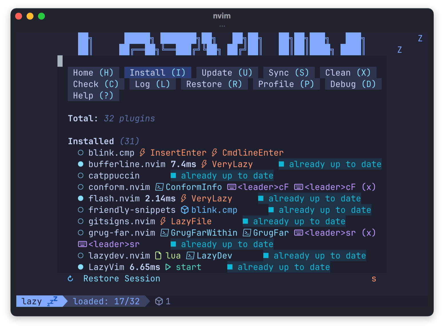 nvim初回起動時にプラグインが自動でインストールされるので、完了するまで少し待ちます。