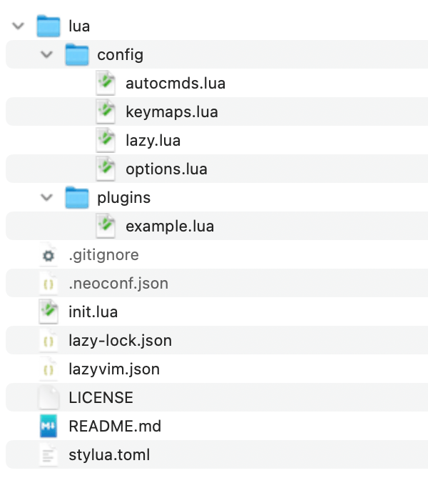 LazyVimのカスタマイズは~/.config/nvim/lua/plugins/にLuaファイルを追加して行います。