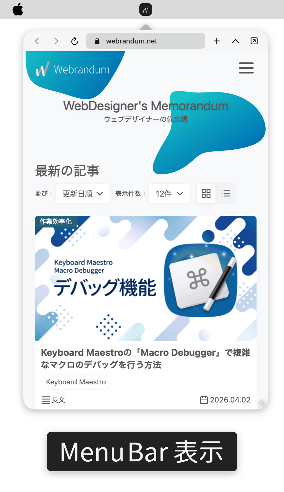 Menu Bar表示は、その名の通りメニューバーにアイコンを追加して、それをクリックするとポップアップでサイトが表示されるようになります。