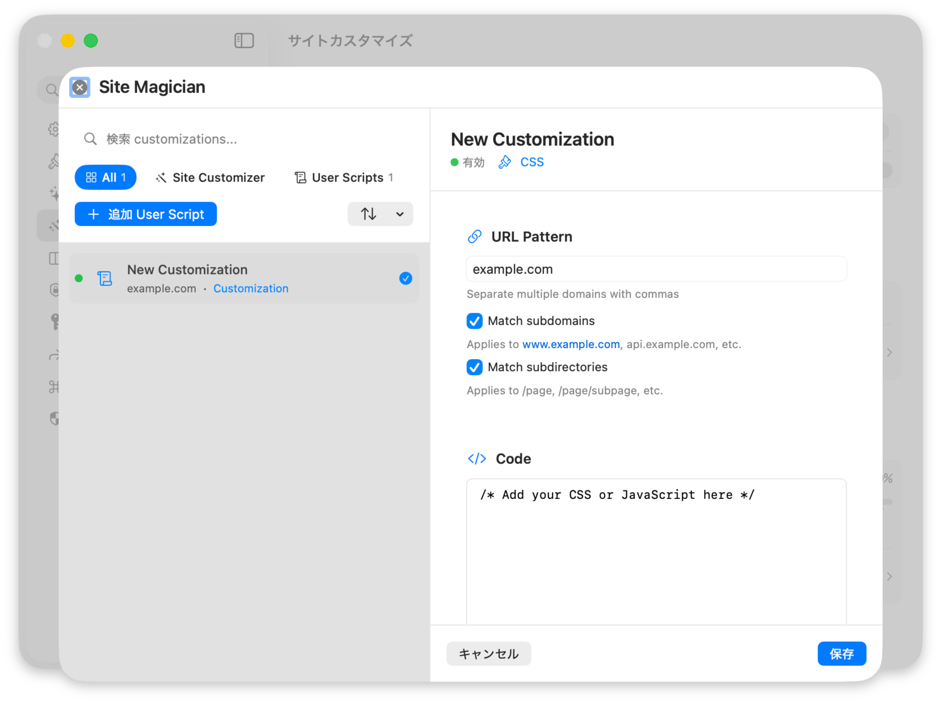 CSSやJavaScriptを入力できるモーダルが表示されるので、[編集]ボタンをクリックして自由に入力して反映できます。