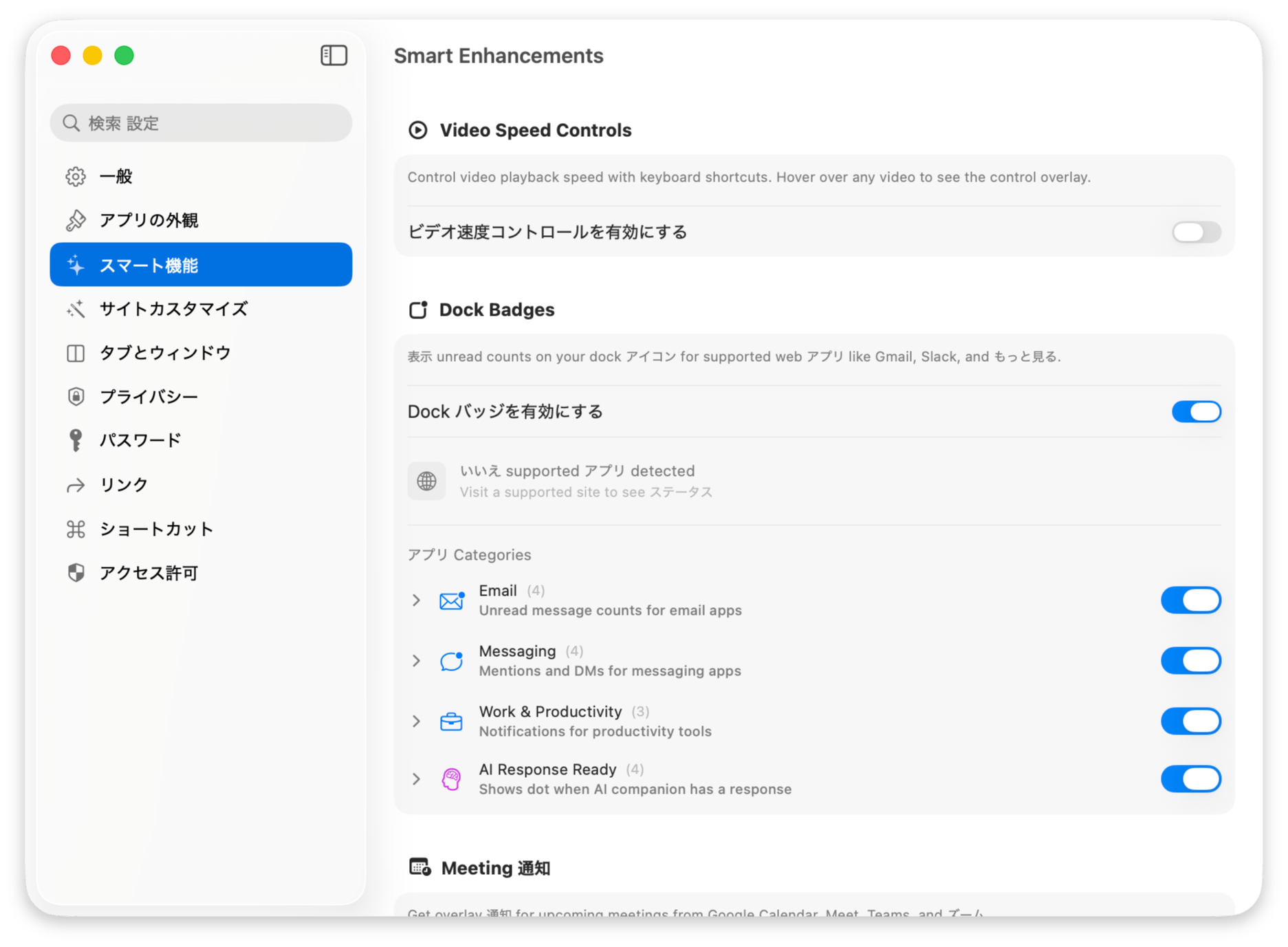 | Dockバッジ(未読数) | 対応 | Chrome通知に依存 | 限定的 |