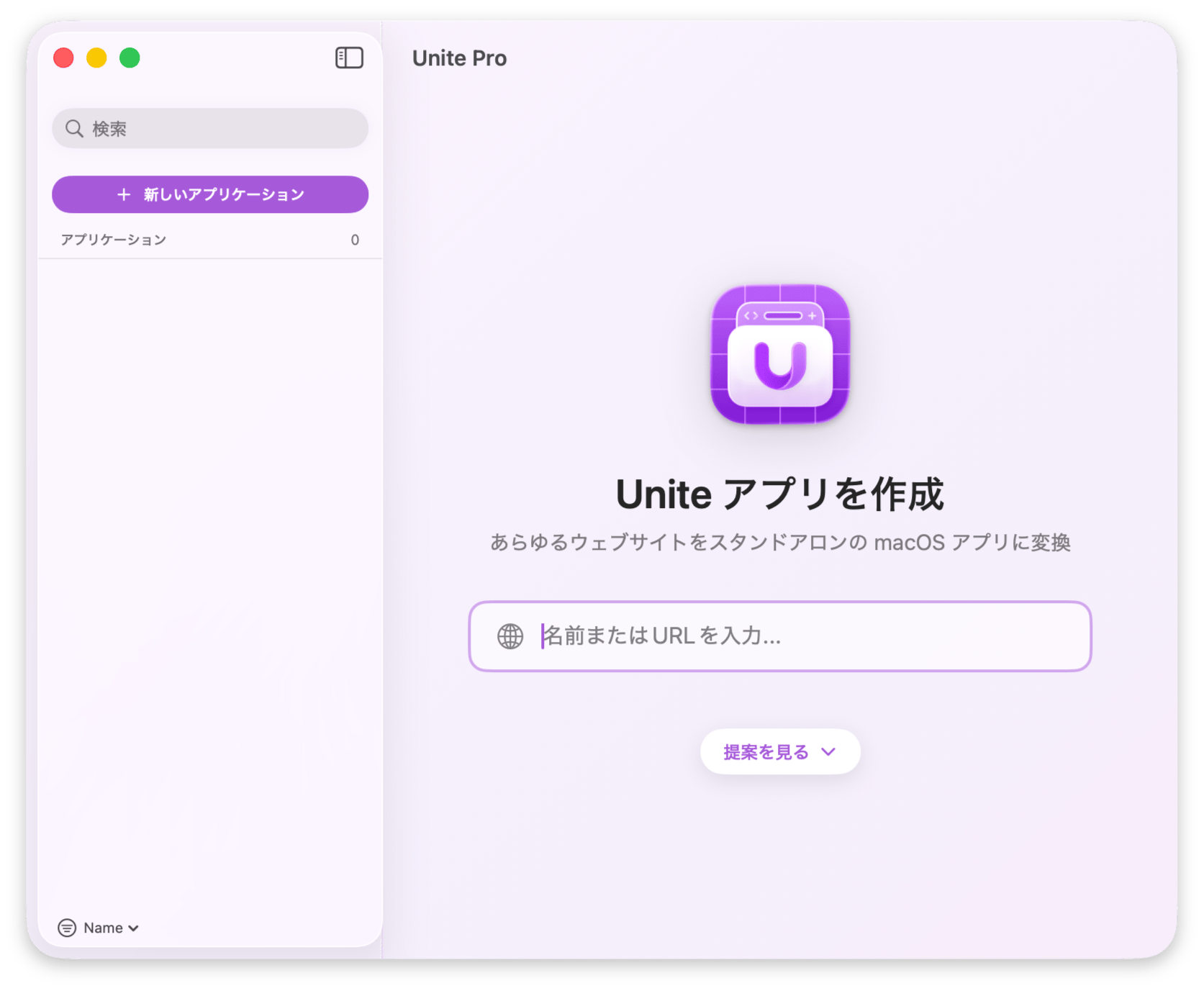 Unite Proを起動すると、アプリ化したいウェブサイトの名前やURLの入力ボックスが表示されます。
