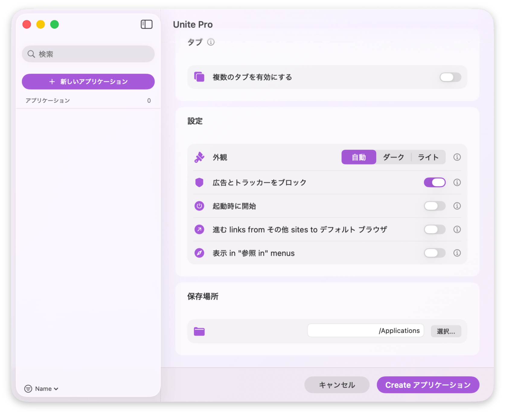 また、保存場所はアプリケーションフォルダと別の場所も選択できますが、基本的には変える必要は無いと思います(もしかするとアプリケーションフォルダの中に「Unite」フォルダを作成し、その中に入れた方がUnite Proで作成したアプリだと管理しやすいかもしれません)。