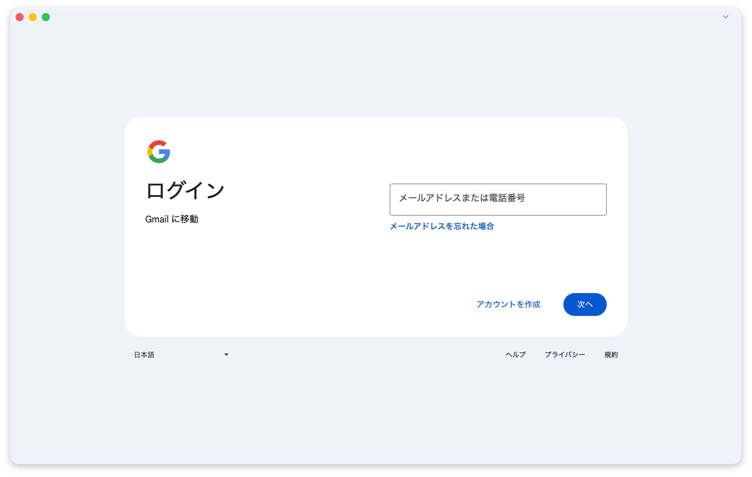 作成したアプリを起動してみると、GmailなのでGoogleアカウントでのログイン画面が表示されます。