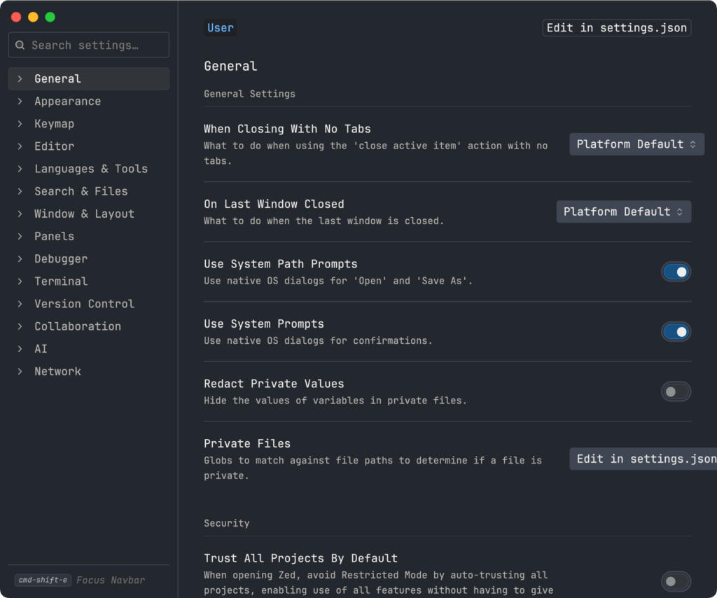 また、ZedはデフォルトでVimモードをサポートしており、設定を変更するだけでVimのキーバインディングを利用できます(環境設定の「Vim Mode」をオンにすると反映されます)。